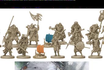 Prenez également la figurine du Chef de votre Clan et les 8 figurines de Guerrier. Placez-y les socles de la couleur de votre Clan. Votre Drakkar porte la couleur de votre clan sur sa voile.