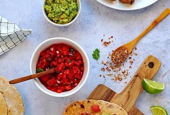 Petit conseil, préparez à l'avance la sauce pico de gallo et le guacamole, vous n'aurez qu'à gérer la cuisson des tortillas et du poulet en même temps. Et ainsi de tout porter à table et de vous régaler.
