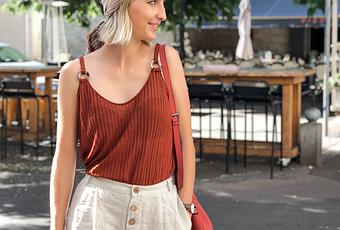 Pour ma tenue, je porte ce top rustique de chez Stradivarius. Pour être honnête avec vous, j'adore son style et sa couleur, mais j'ai été un peu deçue du produit. Tout d'abord le décolleté est beaucoup trop grand. J'ai du faire des noeuds au niveau des bretelles pour pas qu'on ne voit toute ma poitrine. Et j'ai remarqué après les photos qu'il était aussi transparant. Du coup voilà, des solutions existent à ces deux problèmes mais j'attendais mieux quand même en le commandant. Pour le bas, je porte un pantalon en lin qui était très tendance cet été. Fan des boutons, je n'ai pas pu resister en le voyant!