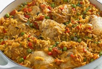 Puis ajoutez en dessus poivron, tomate, pois, paprika, fond de volaille, sel, poivre et eau pour tout couvrir.