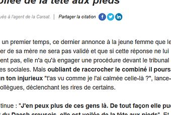 Un dépôt de plainte a bien sûr été adressé au commissariat de Guéret par l’intéressée contre cet agent de la caisse de retraites. Racisme, islamophobie, pauvrophobie… le type cumule. J’espère que des sanctions disciplinaires sévères seront prises contre lui. La peur doit changer de camp. Comme j’ai honte de cette fRance là… Je me souviens du commentaire d’un bas de plafond ici, il y a longtemps, qui me disait en substance que si je n’aimais pas cette France, je n’avais qu’à la quitter. je ne leur ferai pas ce plaisir. Ce sont les racistes et les (même pas néo) fascistes qu’on devrait expulser, qui intoxiquent notre atmosphère quotidienne, par leur bêtise crasse, abaissant notre niveau d’intelligence collective, comme ce nouvel exemple nous le montre si bien. Il n’y a pas de place pour ce genre de discours dans une « démocratie » qui se veut moderne, et l’est visiblement si peu, reproduisant à l’envi les erreurs du passé.