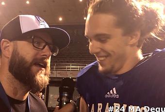 Suite à la victoire des Carabins sur leurs Colocs de la montagne en ouverture de rideau, MdM retrouve son micro pour le tendre sur le nez du premier propriétaire de la discutable ceinture des revirements, #24 MA Dequoy, de l'une des Twin Towers #44 B. Marion et finalement, du pausé et excellent receveur de 4e année #88 LM Normandin.