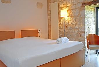 Le résultat est magnifique. Des espaces de différents volumes, des chambres à la fois dénudées et au confort dernier cri avec tous les besoins que l’époque exige, des cours intérieures à l’abri des chaleurs et, de partout, une vue sur les vignes, les champs, et les forêts que seul l’horizon arrête. Espace, confort, sérénité, mobilier très contemporain, les chambres sont le reflet parfait de l’esprit général. Certaines au rez-de-chaussée pour un petit déjeuner « pieds dans la nature », d’autres dans la tour du château, toutes originales et irrésistibles.