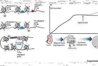 Adipogénèse et Organogénèse du Tissu Adipeux. Au cours du développement du tissu adipeux, les cellules souches sont sensibles au signaux pro-adipogéniques (hormones et métabolites). Ces signaux induisent une série de modifications épigénétiques pour « ouvrir » des régions cibles du génome, contenant les gènes adipogéniques, mécanisme qui semble survenir en deux étapes : implication des cellules souches dans un destin préadipocytaire et une différenciation terminale (A). (…).L’Adipogénèse survient principalement au cours du développement du tissu adipeux (c’est-à-dire pendant la gestation et la lactation). Outre sa formation dans l’embryon, mais aussi après la naissance et jusqu’à la puberté (B). (…).