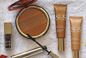 Clarins Collection maquillage Hâle d'été 2018. Pour le teint : Bases de teint SOS Primer teintes Bronze et Mocha (32,50€ chacune), Poudre de soleil édition limitée (47,50€). Pour les yeux & les lèvres : Stylo 4 couleurs (39€), Mascara Supra Volume (28€), Huile Confort Eclat Minute Blackberry (23€). Tous les produits sont disponibles en parfumerie, dans les corners + boutiques Clarins ainsi que sur le site internet clarins.fr