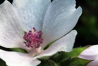 Althaea officinalis (Guimauve officinale) : herbacée vivace veloutée ; feuilles triangulaires peu prondément divisées ; fleurs groupées par 2-5, à 5 pétales blanc rosé. Plante médicinale.