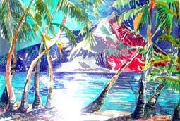 La plupart des hôtels et des pensions louent des vélos, certes pas des vélos de course, mais après tout, il ne s’agit pas de compétition mais de savourer le plaisir d’une ballade sous les tropiques ! Des sièges enfants sont également à disposition. Un panier sur le guidon permet d’emporter beaucoup d’eau, car même si le terrain est plat, le soleil tape fort ! Le Tour de l’île peut être fait sans se presser en 4 heures.La côte Est est la plus habitée, bien que tout soit relatif ! Des curios jalonnent la route côtière et de nombreux arrêts peuvent être prétextés pour voir l’atelier d’un sculpteur ou acheter un paréo.Une fois contournée la Pointe Matira au Sud de l’île, et dépassé les grands hôtels, on retrouve la Polynésie vierge des temps immémoriaux. Seuls de rares fare en pinex bordent la route. Pas ou peu de plages, peu d’ombre devant la majesté du Mont Otemanu. L’horizon est cerné par les motus au loin. Les quelques 42 kilomètres du tour de l’île se parcourent aisément, on mettra cependant pied à terre un peu après avoir dépassé le Club Med. Mais quel plaisir de faire roue libre de l’autre côté de la pente, surtout que la route serpente dans un sous bois qui amènera une fraîcheur relative ! Un arrêt obligatoire est à prévoir au Revatua Club. Un ensemblede constructions en bois blanc abrite une boutique, un restaurant, l’Espadon et une sympatique terrasse. Un ponton sert au départ des activités nautiques. Tout n’est que « luxe, calme et volupté », pas un bruit sinon celui lointain, d’un jet ski qui fend l’écume. Après un arrêt salvateur il ne reste qu’à enfourcher nos montures pour finir la boucle. Tout au long de la balade défilent les motu lointains et enchanteurs. Un voilier gonfle son foc avant de partir pour un day-cruise. Un rameur solitaire pousse son va’a, sa pirogue, jusqu’au bout de ses forces. Hawaiiki Nui est proche, l’entraînement devient drastique. Sur le seuil des petits fare en bois, un vieil homme est abîmé dans la contemplation de l’infini, des enfants jouent autour de lui avec un chiot. De jeunes tane empilent des noix de coco, une vache sortie d’on ne sait où, paisse tranquillement au bord du lagon, les pieds dans l’eau. On est en train de vivre avec délectation un instant d’éternité. A notre passage, les gens nous saluent gentiment. La gentillesse est le maître mot dans les îles, même ici à Bora où l’on dit les gens blasés du tourisme et un peu exaspéré par le défilé constant de gugus en short, des coups de soleil plein le dos et les mollets rougeoyant des piqûres de moustiques de la veille!