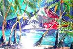 Quel plaisir de pédaler même si nos lourdes montures sont d’une époque antédiluvienne ! Les derniers kilomètres sont peut être un peu difficiles même si les vents sont propices ! Un arrêt de plus, c’est Gauguin qui nous interpelle du regard! Grandeur nature, la palette à la main, en train de peaufiner une toile, sur son chevalet…. Il regarde la route d’un air interrogateur ! mais l’illusion ne dure pas ! C’est en trompe l’œil qu’il est campé sur le gazon de ce curios d’un blanc très tropical, avec ses lambrequins qui soulignent la toiture et les balustrades qui encadrent la varangue. Une très belle boutique. A côté de l’Artiste est planté dans le gazon un panneau indicateur avec la direction et la distance de la plupart des Capitales du Monde. Le panier servira à mettre les pareo et autres flacons de monoï achetés sur la route. On retrouvera son hôtel fourbu mais heureux d’avoir accompli ce petit exploit cycliste ! et un plongeon dans le lagon sera de rigueur pour effacer les courbatures de la journée.