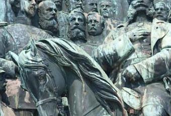 Le principal motif de sculpture du monument, après la mélancolique Germania, c'est l'apothéose de l'empereur Guillaume. Le père de " notre Fritz " est à cheval, le pot en tête, l'épée à la main; d'un bras il montré le Rhin et de l'autre. il s'écrie:" Wacht am Rhein! "