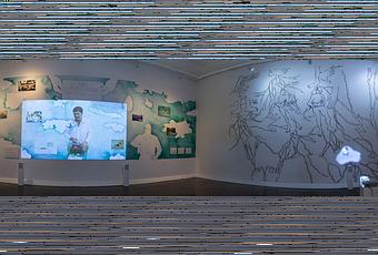 Registre photographique de la deuxième salle de mon exposition The Swimming pool series au Laboratorio de Arte Alameda., 2016. Vidéo La colère de Saturne.