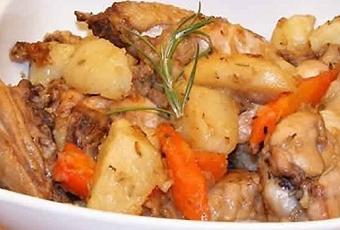 Puis ajoutez l'ail émincée, fond de volaille, vin avec pommes de terre et carottes, salez et poivrez, ajoutez les herbes, remuez le tout.