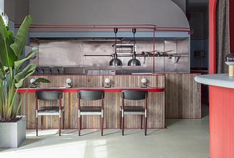 Cette alternance de zones permet aux clients de profiter d’ambiances distinctes mais connectées entre elles. Les palettes de couleurs et de matières du restaurant jouent essentiellement sur le contraste. Des carreaux de mosaïque bleus et blancs sont posés dans l’encadrement des fenêtres en métal rouge de la façade. A l’intérieur, le sol en terrazzo de jade fait face aux tapisseries rouges et bardage de lattes de bois du bar. Les chaises, les luminaires, et chaque meuble du projet ont été conçus sur mesure par Sella Concept.