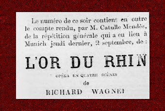 Catulle Mendès, Judith Gautier et Villiers de l'Isle-Adam, après avoir longuement visité Richard Wagner chez lui à Tribschen, se rendent à Munich pour y assister à la répétition générale puis à la première de l'Or du Rhin. Une heure après la répétition générale du 2 septembre 1869, c'est un Catulle Mendès enthousiaste qui rédige "à la hâte" sa chronique de la soirée. Cette chronique sera publiée dans le quotidien Le National du 5 septembre 1869. Un document exceptionnel pour les wagnériens parce qu'il nous permet d'approcher la répétition générale de la création mondiale du prologue de l'Anneau des Niebelungen.