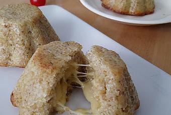 - Verser la préparation dans des moules à muffins (ou autres empreintes de pâtisserie) sans remplir. Enfoncer au centre un morceau de fromage et faire cuire 25 min environ.
