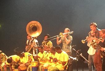 Six percussionnistes, six « soufflants », des danseurs et des danseuses. Ils viennent du Bénin et de la Belgique. Le vent et la pluie ont empêché les musiciens de jouer sur l’esplanade du Théâtre Jean Vilar de Vitry-sur-Seine ce dimanche, mais la musique s’est exprimée, instruments et voix, dès le début de l’après-midi. D’abord dans le grand hall où le public est accueilli, où les tables ont été changées pour cette rentrée, permettant une plus grande convivialité pour les repas qui y sont servis. Et, comme il se doit dans un théâtre, dans la salle de spectacle où musiciens et danseurs ont donné des rythmes et des sons, des pas de danse, des gestes de transe, des chants, des complicités, des rires, à tel point qu’une partie du public s’est jointe au groupe ; certains étaient venus avec leurs instruments pour un boeuf énergique, d’autres se sont mis à danser. C’était brillant, c’était la fête, le plaisir de commencer ensemble une nouvelle Saison.