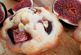 - Verser la préparation dans des moules à petits cakes ou muffins au 3/4 et y enfoncer 3 quartiers de figue par portion et quelques morceaux de chocolat blanc.
