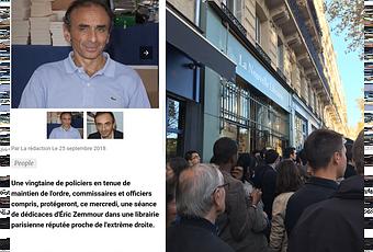A gauche, est-il encore utile de le présenter, le polémiste raciste d’extrême-droite Eric Zemmour, grand falsficateur de l’Histoire de fRance et manipulateur des masses populaires, plusieurs fois condamné pour incitation à la haine raciale et religieuse, dont on sait déjà ici quoi penser à la lecture de son épais dossier. Le gentil petit Monsieur qui œuvre de notoriété publique au bien être de l’humanité est escorté par 20 policiers pour sa séance de dédicace à La nouvelle Librairie fasciste située 11 rue de Médicis, dans le quartier latin, à Paris.