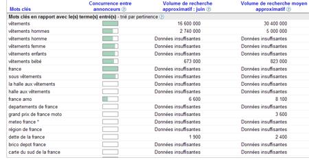 Et voilà, suite à mon billet sur les données disponibles sur Google Trends, il semblerait que Google prenne la mauvaise pente que j'avais imaginé... en livrant des données qui à mon sens sont trop sensibles pour être divulgées... Ainsi sur l'outil de suggestion des mots clés du moteur, on a désormais les volumes de recherches des mots clés, non pas en barre verte comme avant, mais avec une volumétrie chiffrée maintenant! La courses aux mots clés va être encore plus âpre avec ce nouvel ajout sur son outil maison!