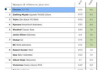 2°) Il y a du bon et du moins bon dans le couteau japonais, cas du couteau Kaï-Shun qui sous-performe à tous points de vue, tranchant inférieur, durabilité moindre malgré une trempe plus élevée. Leçon à en tirer : un produit ne dépend pas que de ses ingrédients premiers mais est la somme de la qualité des artisans qui interviennent à chaque process, dont l'affûtage bien évidemment.