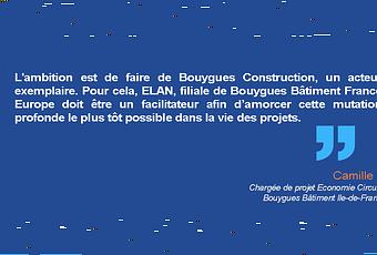 ELAN, filiale de conseil en immobilier de Bouygues Bâtiment Ile-de-France, a amorcé une mutation profonde de son identité et de son savoir-faire. C’est dans ce cadre qu’elle a créé une offre de conseil en économie circulaire. Son objectif principal ? Accompagner les clients à anticiper les mutations de leurs modes de vie et leurs impacts. En leur permettant de créer de la valeur économique, sociale et environnementale, ELAN augmente leur compétitivité au travers de projets innovants pour une performance économique durable.