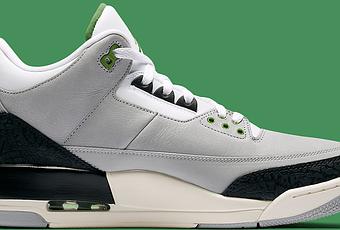Le schéma développé démontre une cohérence pointue avec la Trainer 1. On retrouve ainsi une palette de nuances mettant en lumière une triple association de blanc, de gris clair et de noir pour une base dominée par un visuel assez sobre. La clef de cette itération réside évidemment dans cette teinte chlorophyll que l’on retrouve par indices minutieux mais suffisants pour être remarqués et donner une nouvelle dimension au design. Présents sur une partie des œillets ainsi que sur la doublure interne de la languette et la semelle interne on découvre également le Jumpman du talon et de la languette sous cette même nuance colorée. Cette Air Jordan 3 Chlorophyll devrait être disponible à la vente le 10 novembre chez les retailers Jordan habituels et sur le Nike Store pour 190 euros.