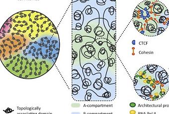 Schéma illustrant la structure hiérarchique 3D* de la chromatine. Le noyau est divisé en territoires occupés par des chromosomes seuls, qui ne se chevauchent ni ne s’entremêlent de manière significative, sauf pour ce qui est des associations compartimentales aux interfaces. Il existe deux compartiments actifs, le compartiment A et le compartiment B. Beaucoup de groupes d’interactions coexistent, distribués dans tout le noyau, où la chromatine appartenant à un même type de compartiment s’associe. Localement, la chromatine s’assemble en domaines d’association topologiques (TADS). Deux modèles différents de TAD sont décrits : ceux propres à la souris (haut) et ceux propres à Drosophila (bas). Les flèches oranges indiquent le mouvement de la cohésine pendant l’extrusion de boucle. Abréviations : CTCF : facteur de liaison au CCCTF ; RNA Pol II, ARN polymérase II.