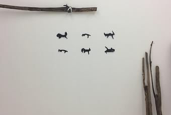 Elle travaille le regard du spectateur, par exemple en répliquant les poteaux situés devant la galerie, elle les met en évidence quand on aurait tendance à ne plus les voir. Et les supports qu’elle utilise expriment aussi un point de vue : des serpillières pour accueillir les photographies de villas à Royan, des tapis ovales (comme des mandorles) en sisal pour accueillir les représentations de la ville de Shenzen.