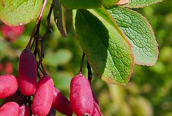 Berberis vulgaris (Berbéris commun, Épine-vinette commune) : arbrisseau à rameaux (jaunes à la cassure) portant des épines habituellement à 3 pointes ; feuilles simples caduques à dents épineuses en bordure ; grappes de fleurs jaunes, baies allongées, vertes puis rouges, en grappes lâches. Plante toxique, notamment les fruits avant maturité à l'inverse des fruits mûrs qui sont comestibles.