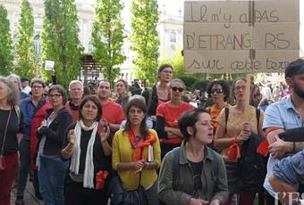 Pour un simple petit rassemblement d’une cinquantaine de personnes au départ sur une liste de diffusion locale inter-orgas (toujours un peu les mêmes hélas, sur qui beaucoup trop de choses reposent, au point qu’ils s’épuisent…), se retrouver à plusieurs centaines (350 selon la Police) voilà qui fait chaud au cœur. Les organisateurs comme les services de l’Etat ont d’ailleurs été dépassés par le cours des événements puisque la manif devait être statique au départ, et que devant le nombre de participants, elle a du s’élancer fièrement dans les artères principales de la ville, jusqu’à la place Stan, pour le discours final, aux cris de « solidarité avec les réfugiés, un pavillon pour l’Aquarius ! », entonnés avec une voix de stentor jusque devant les terrasses des cafés des alentours..