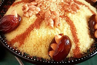 - Dresser le couscous dans un plat de service, le garnir d'amandes concassées, de cannelle, de dattes farcies aux amandes et de noix.
