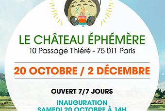Le Château Éphémère s’implante dans un espace exceptionnel de 60 m², dans un décor empreint de poésie. Un pop-up store qui viendra à proposer aux fidèles amateurs des productions du studio Ghibli des centaines de produits dérivés (près de 300) officiels directement importés du Japon, parmi lesquels on retrouvera des figurines, porte-clefs, peluches, besaces, des mugs etc… une caverne aux trésors de Totoro et autres personnages des studios Ghibli.