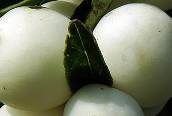 Symphoricarpos albus (Symphorine) : arbrisseau à feuilles entières opposées ; fleurs en forme de grelot réunies en petites grappes terminales ; grosses drupes blanches, globuleuses et spongieuses Toute la plante est faiblement toxique. Espèce invasive.