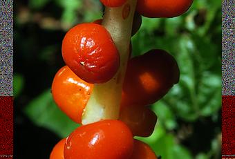 Arum maculatum (Arum tacheté) : feuilles en forme de pointe de flèche, tachetées ou non ; fleurs en épi autour d'un axe charnu (spadice) surmonté d'une massue, violette à brunâtre, spadice enveloppé dans une grande bractée (spathe) verte à jaunâtre, parfois ponctuée ; grappe compacte de baies ovoïdes vertes, orange puis rouge brillant. Baies très attirantes pour les jeunes enfants et très toxiques comme tout le reste de la plante.