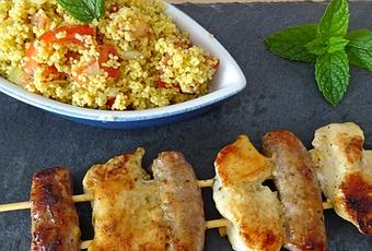 Brochettes Poulet/Chipolatas - marinade miel/épices/agrumes - semoule parfumée aux agrumes