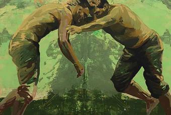 A Paris, le changement de motif est assez radical puisque Claire Tabouret délaisse le thème de l’enfance pour traiter celui de la « lutte » au sens littéral comme figuré. En effet, à travers la représentation de lutteurs pour l’essentiel adultes, l’artiste se livre à une métaphore filée sur la dualité.