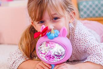 Ces animaux colorés et trop mignons sont un peu magiques : leurs visages changent grâce aux sequins réversibles. Nous avons reçu à la maison une petite licorne toute rose avec un visage endormi. Le design du jouet est plutôt sympa et s'inscrit dans un modèle Kawaii.Le combo licorne + paillettes + nœud sur la tête a été le combo gagnant pour Willow qui a de suite adopté cette demoiselle. Il suffit de retourner les sequins pour réveiller la licorne qui passe d'un visage calme et serein à une expression d'étonnement ( voir de peur ? )