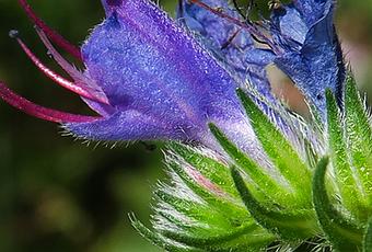 Echium vulgare (Vipérine) : herbacée bisannuelle ; tige robuste dressée, hérissée de poils raides ; feuilles lancéolées hérissées de poils raides ; fleurs rassemblées en grappes nombreuses s'échelonnant le long de la tige, corolle à symétrie bilatérale rougeâtre devenant bleue, étamines saillantes.