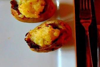 Après avoir fait cuire des belles pommes de terre Yukon Gold au four (6), on leur enlève un "chapeau" et on les vide à moitié. La chair enlevée servira ailleurs, ou encore mieux, sera ajoutée à ceci qui farcira les "bateaux" de pommes de terre...
