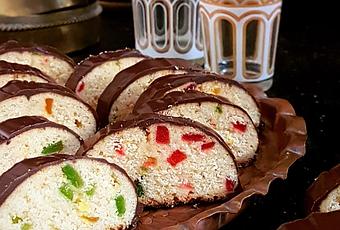Aujourd'hui je partage avec vous une recette de fekkas aux fruits confits nappé de chocolat .. De délicieux biscuits qui s'accompagnent à merveille avec un thé à la menthe