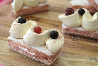 A l’aide d’une douille à st honoré, pochez la crème sur les biscuits roses. Ajoutez les fruits rouges dessus et un peu de poudre de biscuit rose.