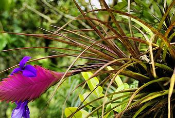 Tillandsia usneoides, appelé aussi « Barbe de vieillard » ou « Mousse espagnole » (photo ci-contre), mérite qu’on s’y attarde car il est différent des autres : vivace epiphyte, son port est retombant et peut atteindre 8 m de long ; il a des petites feuilles douces vert de gris avec des petites fleurs odorantes n’excédant pas 1 cm.