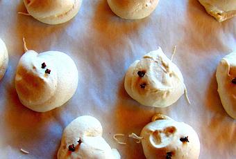 Avec de l'aquafaba... on bricole des meringues en suivant ce modus. On dépose à la douille (ou pas) sur des plaques, en leur donnant une forme de fantôme, ou de monstre... avec des clous de girofle en guise d'yeux, et ils sont prêts à aller faire dodo au four.