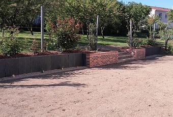 Il s'agit d'un aménagement paysagé comprenant un muret en briques avec une retenue en ardoises complétées de plantations et engazonnement