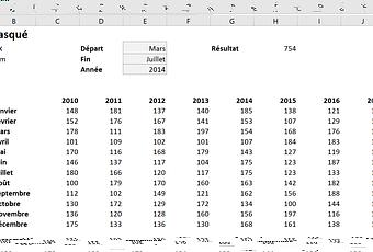 Récemment, lors d’une de mes formations en modélisation financière dans Excel, une question intéressante m’a été posée par un apprenant. Il souhaitait savoir si on pouvait, à partir d’un tableau de données à deux dimensions (mois et années), calculer une période de temps dont le calcul dépendrait de 3 paramètres, spécifiés par l’utilisateur: mois de départ, mois de fin et année. La réponse est oui! Cet article vise à vous enseigner la technique sous-jacente.