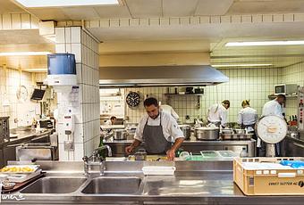Nous sommes samedi matin, dernier jour de la semaine pour l’équipe (fermé dimanche et lundi), la mise en place est « plus légère » que les autres jours. Mais n’allez pas imaginer qu’on se tourne les pouces en cuisine, ce n’est clairement pas le cas. Il faut dire qu’il y a énormément de petites choses à faire : faire les petites boules de cuchaule à la friteuse pour les fourrer avec de la moutarde de bénichon, préparer ces petites mises en bouche qui sont englouties en 2min, mais qui prennent des heures à faire, ou encore préparer les délicieuses mignardises (tartelette au vin cuit pour la partie FR, et bouchon vaudois pour l’autre ;) Ah, et j’oublie l’essentiel : la brigade du chef n’est composée que de ….8 personnes, dont 2 pâtissiers et lui-même. Ce n’est donc pas le même rythme que dans les très grandes brigades.