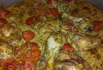 Une recette toute simple de tous les jours: des pilons de poulet au four avec une sauce à la moutarde, au vin blanc et aux tomates fraiches;