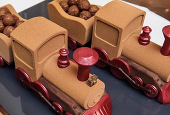 Cette gourmandise est composée d’une mousse légère au chocolat à la citronnelle avec un confit frais et délicieux de banane à la vanille et au citron vert, le tout sur un croustillant à la cacahuète et fleur de sel et un biscuit chocolat sans farine sur une base de chocolat noir. Côté décor, les pares-chocs et les cheminées sont garnis de l’excellent praliné cacahuète enrobé de chocolat blanc. Le chariot du petit train est garni de truffes chocolat/citron vert