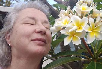 Le moteur de la piscine vient de s'arrêter, laissant place aux chants des oiseaux et au silence jamais tout à fait silencieux dans ce beau pays. Il fait chaud et humide. Probablement autour de 30°C. Assise sur le canapé de la terrasse, je sue une légère brume qui s'évapore par la petite brise qui souffle de temps en temps. Le frangipanier (photo) embaume l'atmosphère de sa douce fragrance envoûtante.