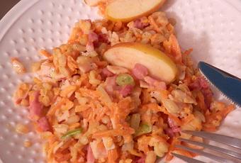 Tags : plat complet, poêlée, repas du soir, ebly, blé, carotte, patate douce, pomme, blanc de poulet, lardons, crème fraîche, muscade