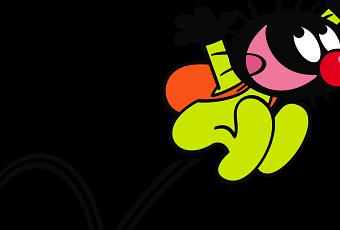 En fait de bulles, ici, il n’y en a point. Il y a simplement des cases et un drôle de petit personnage qui s’y balade, tout noir avec un gros nez rouge et quelques poils sur le caillou.